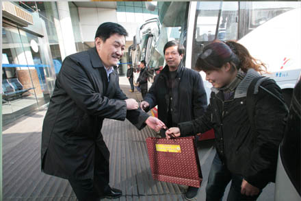 2012年1月22日下午,集團公司董事長、黨委書記吳宗昌、總經理、黨委副書記王謙等集團公司領導先后來到總站南、北兩區,親切慰問仍然工作在春運一線的干部職工。兩站前廣場鞭炮齊鳴、煙花共舞,同慶即將到來的2012年新春佳節。