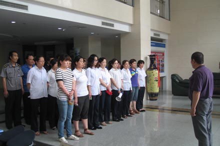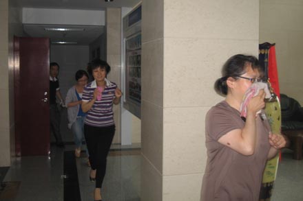 演練中,值班保衛(wèi)人員發(fā)現(xiàn)火情,立即向當(dāng)值領(lǐng)導(dǎo)匯報(bào),并用樓道滅火器進(jìn)行初期滅火,控制火勢(shì)蔓延,與此同時(shí)另一保衛(wèi)人員迅速撥打119報(bào)警,準(zhǔn)確描述起火地址、單位、火勢(shì)等信息。當(dāng)值領(lǐng)導(dǎo)接到報(bào)警后,立即啟動(dòng)火災(zāi)疏散應(yīng)急預(yù)案,救援小組迅速斷開大樓電源開關(guān),并關(guān)閉電梯;滅火小組人員火速趕赴現(xiàn)場進(jìn)行滅火;警戒組在火災(zāi)現(xiàn)場拉起警戒線,維護(hù)現(xiàn)場秩序,并安排專人在一樓疏導(dǎo)車輛,保證消防通道暢通;疏散小組組織總部員工用濕毛巾捂住口鼻,低頭彎腰從兩側(cè)消防通道迅速有序撤離;救援小組隨即對(duì)各樓層進(jìn)行緊急搜救。5分鐘后,全體人員撤離到樓下安全地帶。經(jīng)清點(diǎn)人數(shù),所有員工全部安全疏散。