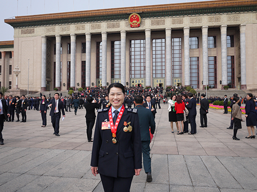 山東交運濟南長途汽車總站總服務指導師李文與全國其他勞模在北京人民大會堂前合影。