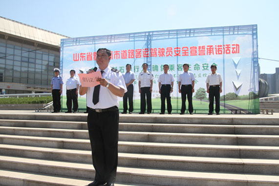 為貫徹落實國家安全監管總局、交通運輸部、公安部《關于在道路客運行業深入開展駕駛員安全承諾和安全教育工作的通知要求》,山東省政府安委會于2015年6月12日組織開展了道路客運駕駛員安全宣誓承諾活動。作為全省道路客運的龍頭單位,集團公司由安全總監朱永順同志帶隊,組成三個方隊參加了此次活動,駕駛員劉軍作為全省駕駛員代表宣讀了倡議書,并作為領誓人帶領現場400余名駕駛員進行莊嚴宣誓。