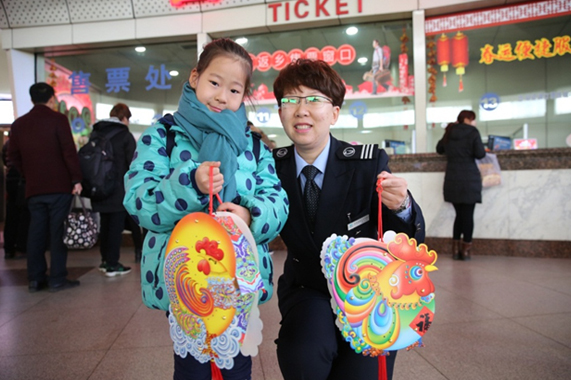 “雞”祥燈籠照亮旅途 近日,在濟南長途汽車總站乘車的高研欣小朋友開心地收到售票員送上的“雞”祥燈籠,這是總站為配合元宵節運輸開展的“唱兒歌送吉祥”活動,活動規定從即日起至正月十五,凡在總站購票的小朋友,只要能唱出與元宵節相關的兒歌,即可獲贈“雞”祥燈籠一個,為旅途增添節日了一份節日的歡樂。