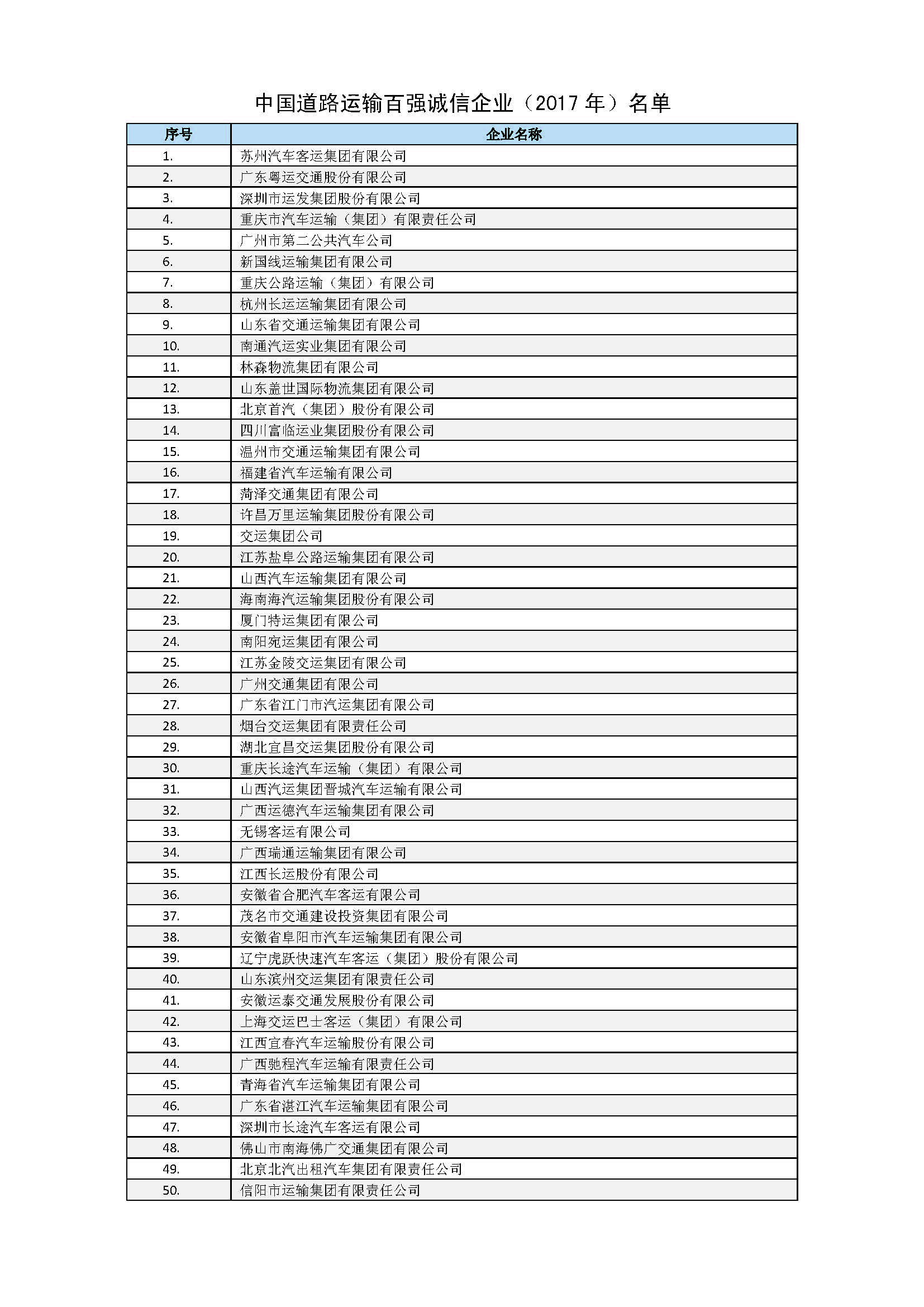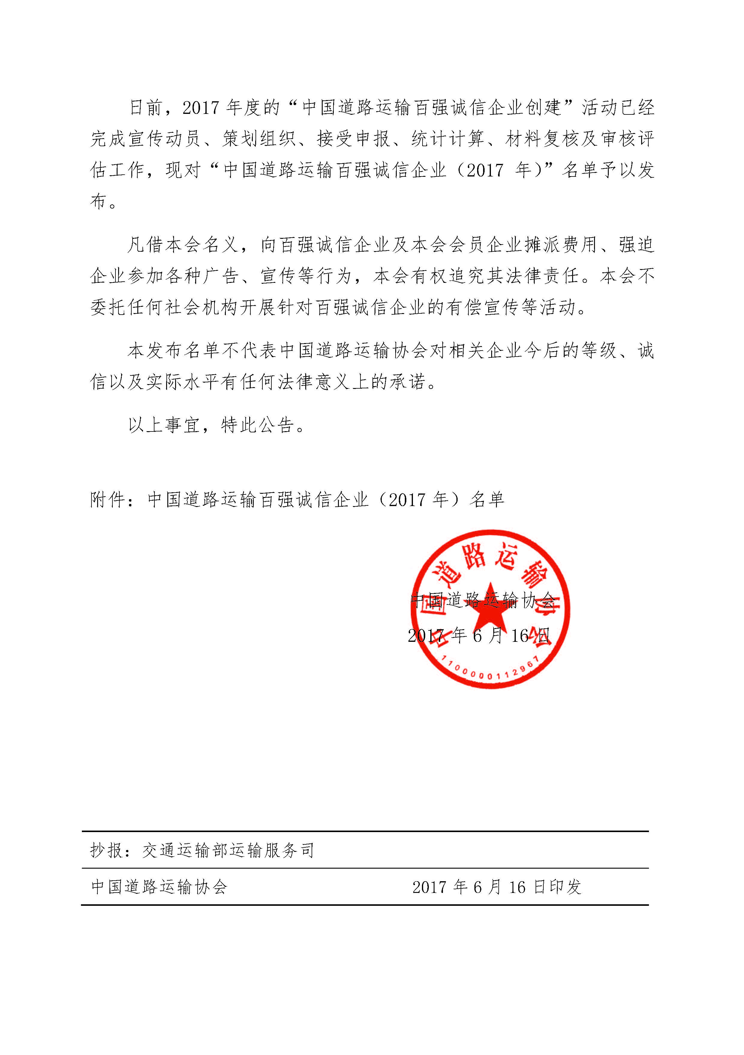 集團公司榮獲“中國道路運輸百強誠信企業(2017年)”第九位