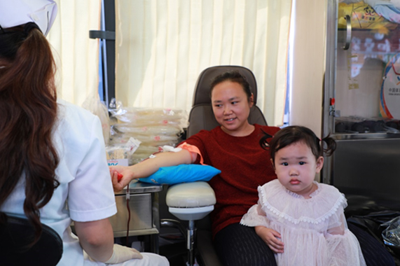 在獻血現(xiàn)場,有一個兩歲的小姑娘引起了我們的注意,有點害羞的她躲在一位老人身后。本以為是過往的旅客,可是后來得知她是交運石化公司員工趙欣的女兒,知道媽媽要獻血,懵懵懂懂的她也來到現(xiàn)場,感受媽媽是如何盡己之力幫助別人的!