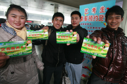 在售票處,總站專門 為增設(shè)了“藝考生購票窗口”,就青島、濰坊、淄博、曲阜等藝考線路,向藝考生提供優(yōu)惠和優(yōu)先的購票服務(wù)。為方便眾多藝考生在多個考點城市中轉(zhuǎn)乘車,總站還在藝考生中轉(zhuǎn)趕考集中的43號檢票口,特別設(shè)立了“藝考生服務(wù)臺”,并推出預(yù)約乘車、送藝考生趕考的便捷服務(wù),藝考生只需憑借準(zhǔn)考證,即可享受優(yōu)先預(yù)訂中轉(zhuǎn)客票、優(yōu)先乘車的“預(yù)約趕考服務(wù)”