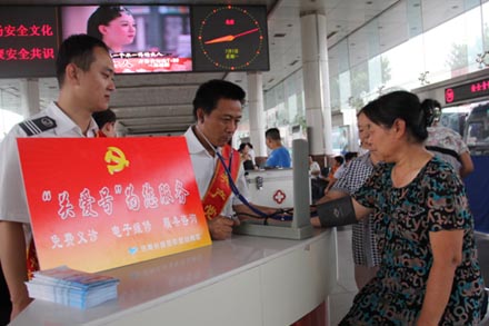 在總服務(wù)臺(tái),總站南區(qū)雷鋒大夫魏德泉為乘車旅客提供免費(fèi)義診和夏季乘車健康咨詢服務(wù);由車站微機(jī)室、后勤科組成的電子維修組,為旅客提供免費(fèi)的手機(jī)充電器,提供免費(fèi)電子、電器簡單維修服務(wù);由一線服務(wù)科室黨員組成的服務(wù)咨詢組在公交站牌、旅客中轉(zhuǎn)換乘區(qū)設(shè)立了免費(fèi)咨詢服務(wù)崗,為旅客提供免費(fèi)咨詢和行李運(yùn)送服務(wù),并在長廊設(shè)立了“黨員送水車”,為旅客提供免費(fèi)送水服務(wù),得到了旅客的一致好評(píng)。