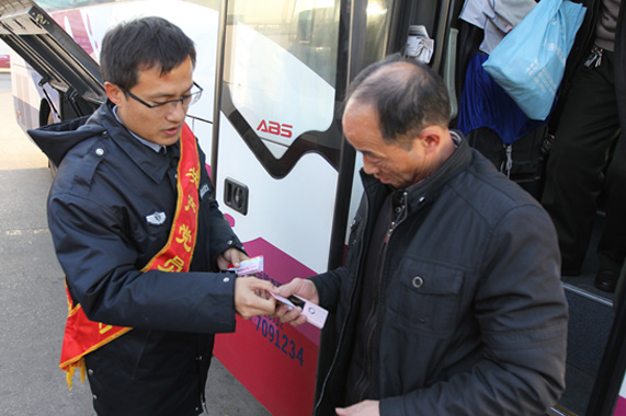 12月26日,總站南區黨委在旅客到達區針對返程旅客開展了營銷拓展活動,向到站旅客派發印有2016年全年日歷的“感恩回饋會員卡”,并在客流密集區進行班車和旅客的疏導和服務工作,確保服務區域內車流、人流暢通有序,秩序井然;同時還主動為旅客搬送貨物、引導貨物辦理業務;以優惠卡為媒介,推廣南區微信公眾平臺,幫助旅客通過微信購票,享受優惠、便捷的售票服務。