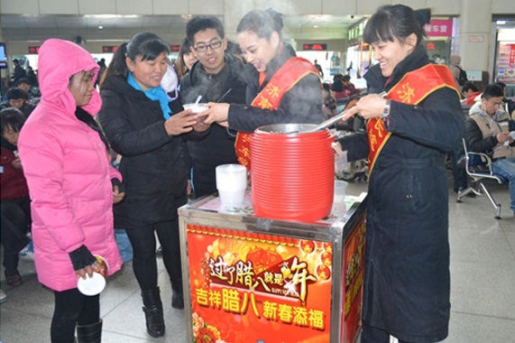 您現在的位置是:首頁 > 客運場站產業 總站臘八粥,溫暖回家路 次 客運場站產業 發布時間:2016-01-26 15:20:28 總站臘八粥,溫暖回家路 1月17日是中國傳統佳節臘八節,民間一直流傳著喝“臘八粥”的習俗,為了讓奔波在外的旅客在節日來臨之際喝上熱氣騰騰的臘八粥,總站員工一大早就開始準備各種原料,精心熬制。上午9點,將寓意祝福的臘八粥運到候車大廳,邀請廣大旅客免費品嘗,總站領導為旅客盛粥、送粥,表達祝福。歡樂的節日氣氛引來眾多旅客駐足,美味的八寶粥受到廣大旅客的歡迎和稱贊。 (總站宣)
