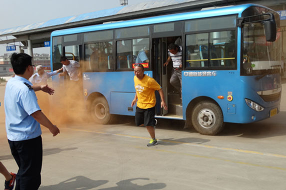 6月28日上午9時,隨著平陰客運中心院內突然傳來一聲爆炸聲,模擬停車場班車發生火情,一陣黃色的煙霧從公交車底散出。工作人員第一時間用滅火器滅火并輸散旅客和車輛,同時迅速通知消防隊及救援人員火速到達現場處理后續事宜,力爭將損失降至最低。